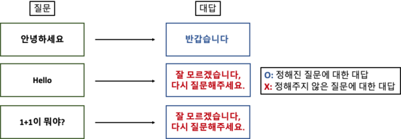 대표적인 인공지능(AI) 기술에는 챗봇이 있습니다. 더욱 정확히는 과거의 챗봇 기술입니다. 이것은 미리 주어지는 질문에 대한 대답을 정해두는 것으로 구현됩니다. 예를 들어, "안녕하세요" 라는 질문의 대답만을 챗봇에 "반갑습니다"로 저장해두었다면, 해당 질문에 대한 대답을 일관되게 저장해두는 것입니다. (답: 반갑습니다.) 반면, 새롭게 들어오는 질문들에 대해서는 일관적으로 정해진 답을 또 하는 것이지요. (답: 잘 모르겠습니다. 다시 질문해주세요) 아직 많은 산업에서는 이런 기술을 기반으로 AI를 만들어 두었습니다.